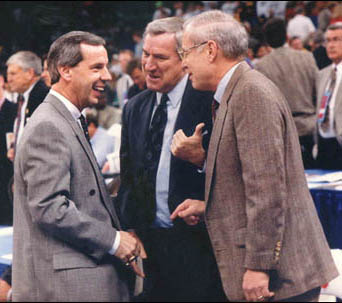 It was also the original ACC that had a lot of flamboyant and temperamental coaches, including Lefty Driesell at the University of Maryland and Jimmy Valvano at North Carolina State University. Their emotional outbursts, accompanied by chair-throwing and screaming and violent gesturing at everybody, including the officials, often made the headlines more than their coaching (Valvano, it turns out was a softie underneath all those theatrics, and I’ve grown to appreciate his more subdued and valiant battle with cancer and his philanthropy that has continued since his death).